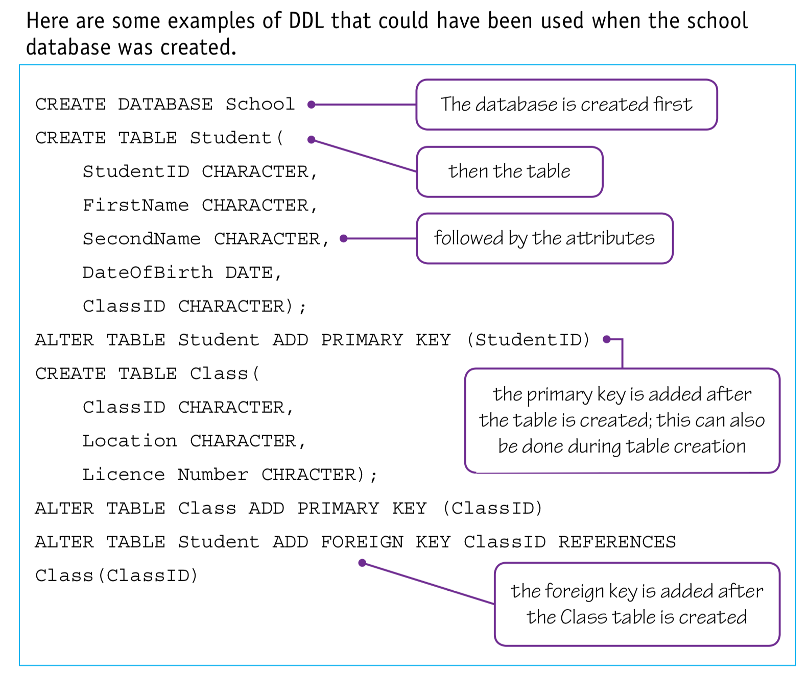Show understanding that the DBMS carries out all creation/modification of the database structure using its Data Definition Language (DDL)