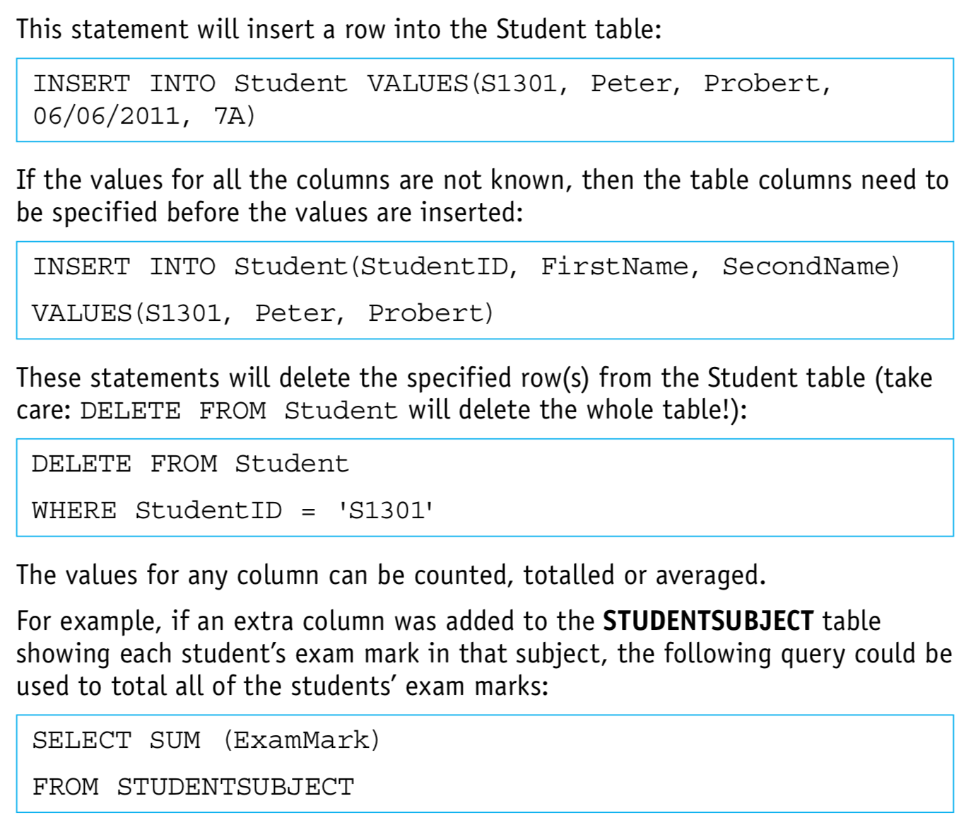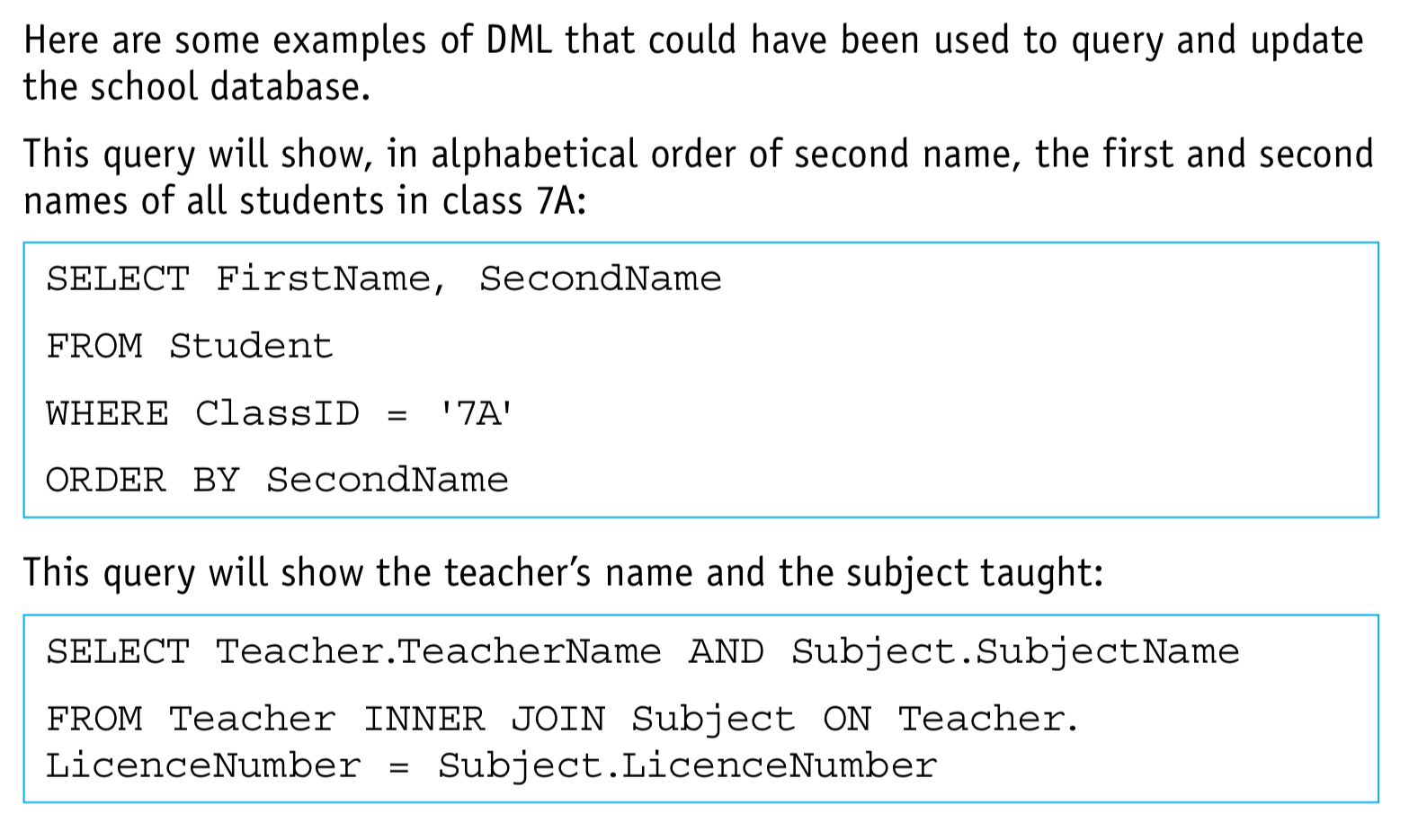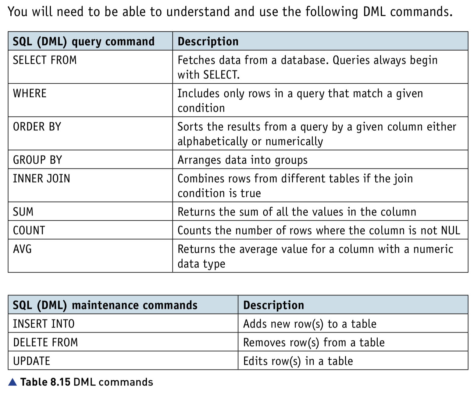 Show understanding that the DBMS carries out all queries and maintenance of data using its DML